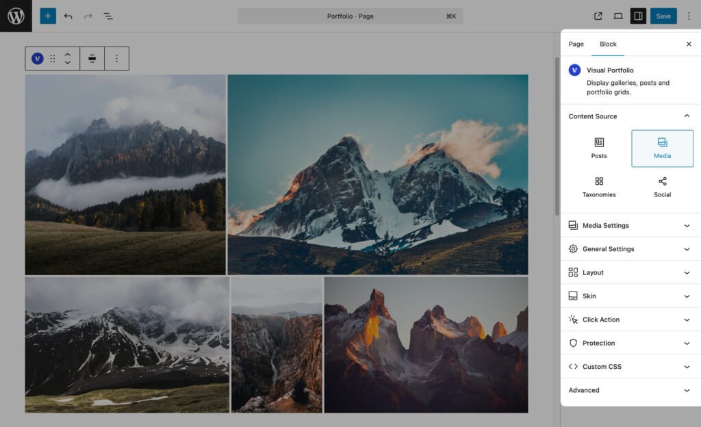 Visual Portfolio supports multiple content sources, so you can build galleries from different types of content in WordPress. Available content sources: