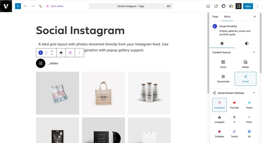To use social media content in your Visual Portfolio: