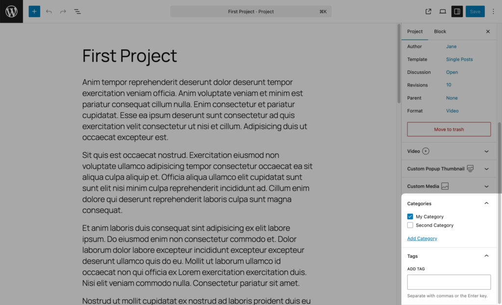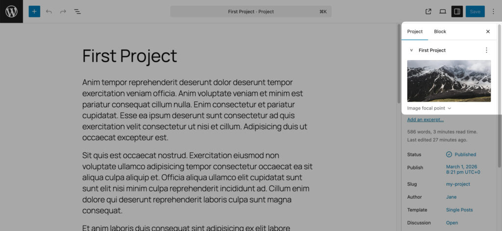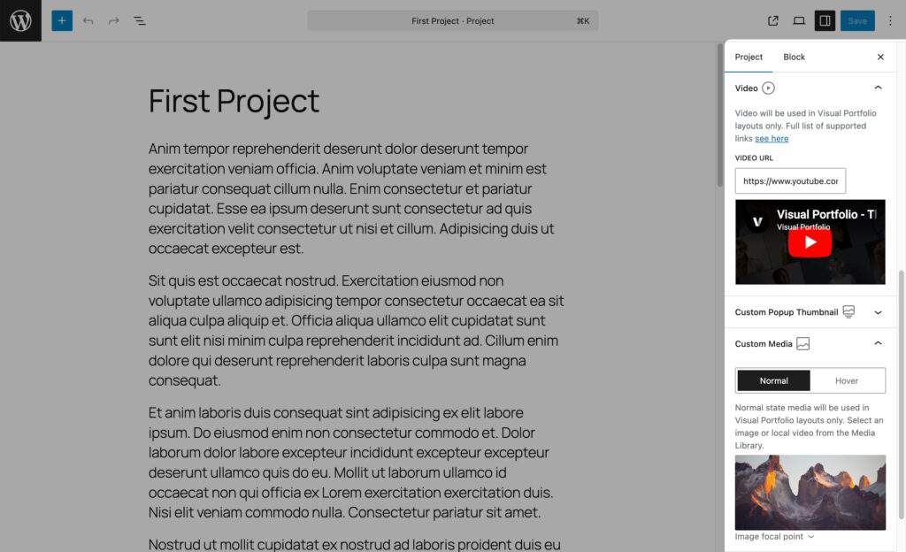 The Visual Portfolio plugin offers a custom post type called Project, designed to help you effortlessly publish and organize your work using categories and tags, similar to managing regular posts.