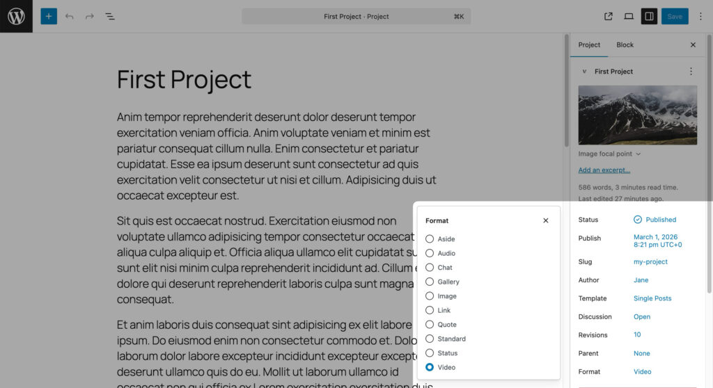 - Video: For video projects (YouTube, Vimeo, etc.). When selected, the Video URL field becomes available.