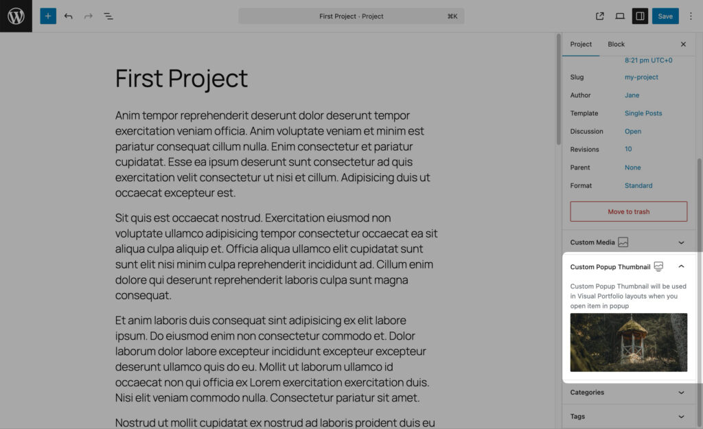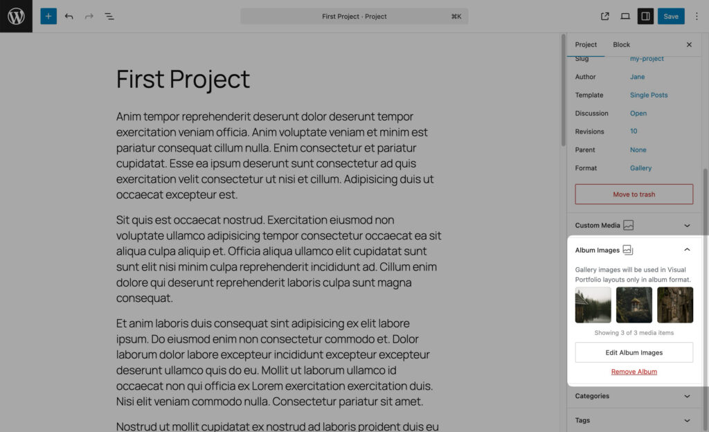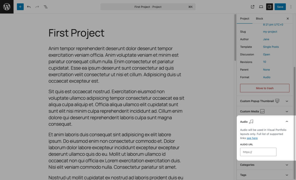 - Post Format: Choose the format that best represents your project (Standard, Video, Audio).
