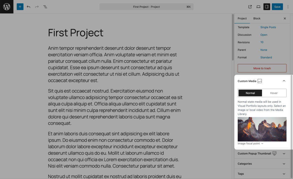 Managing your project settings in Visual Portfolio involves both standard settings and custom meta settings, providing you with extended functionality to showcase your work effectively.